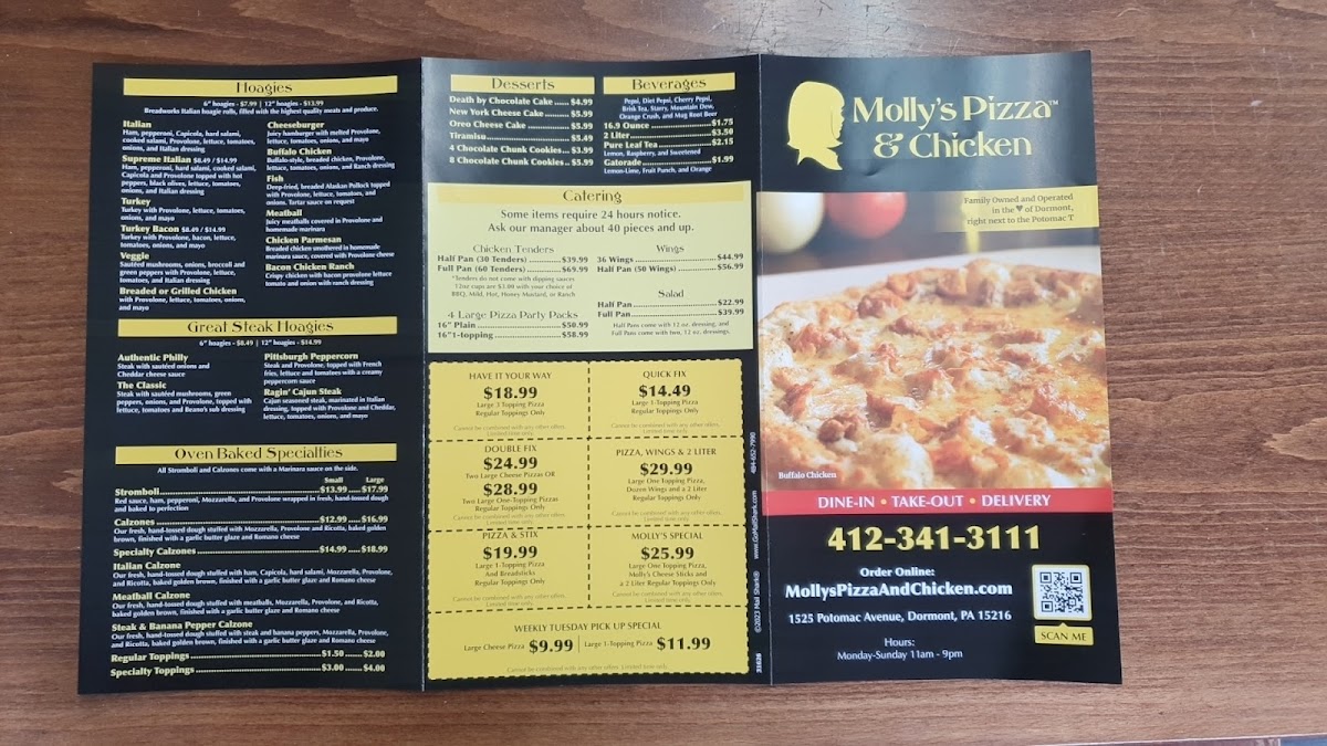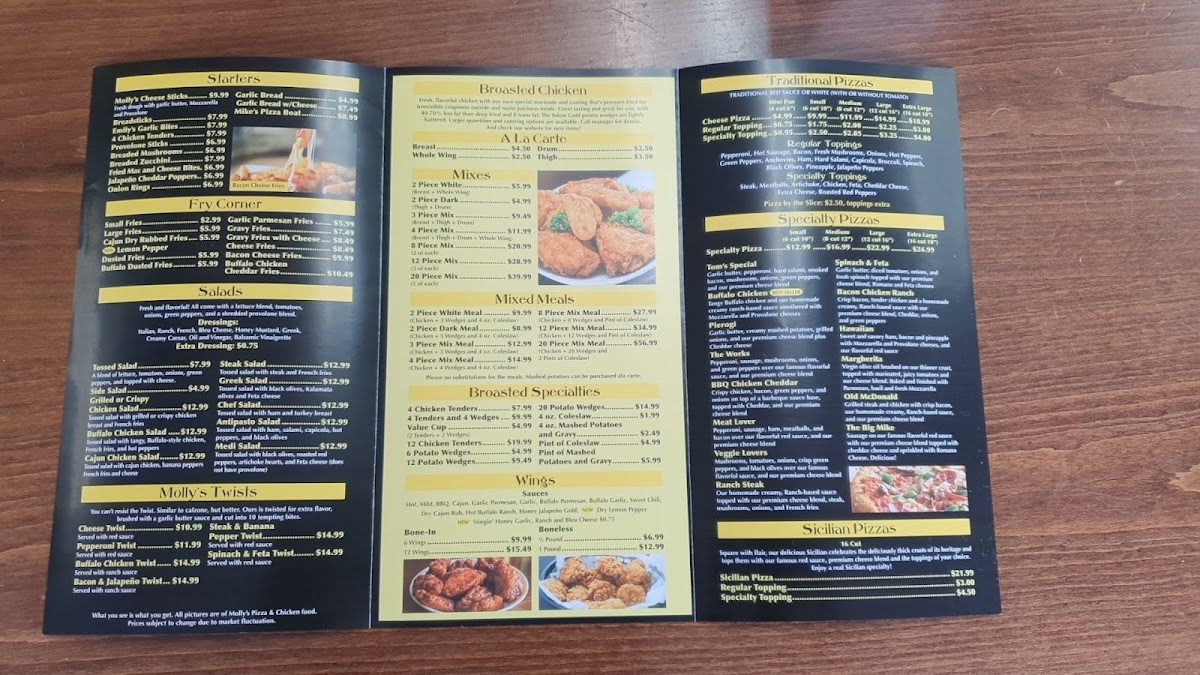 The menu at Molly's Pizza and Chicken offers a relaxed and approachable selection that’s perfect for a casual meal, whether you're dining in or enjoying delivery at home. With a focus on hearty, comforting dishes, the menu features classic pizzas, crisp broasted chicken, and satisfying sides that complement the friendly, no-fuss atmosphere.